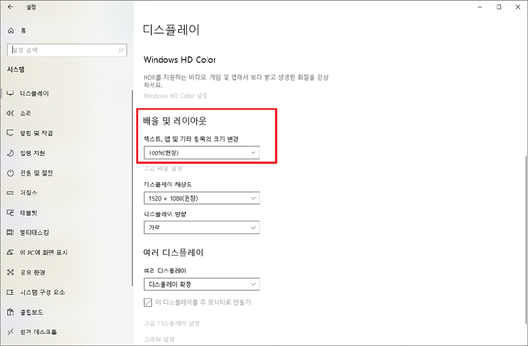 1. 윈도우 설정 - 시스템 - 디스플레이 내 배율 설정 > 100%으로 조정되어있는지 확인