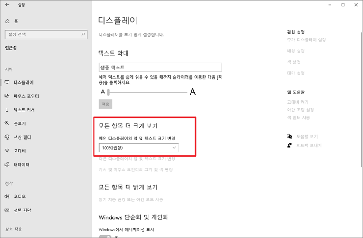 2. 윈도우 설정 - 시스템 -  접근성 - 텍스트 크기 > 100%으로 조정되어있는지 확인